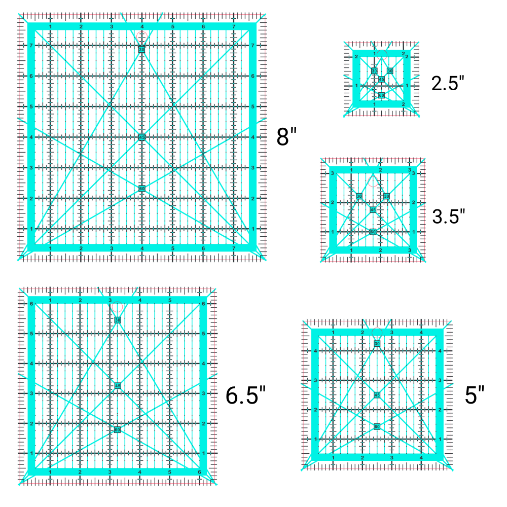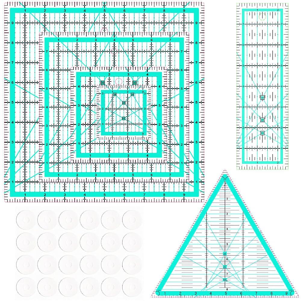 - Quilting Ruler Sets:Quilting rulers includes 5 quilting square rulers (2.5",3.5",5",6.5",8")to meet your different needs.The non-slip rings keep the quilting templates in place to ensure cutting accuracy