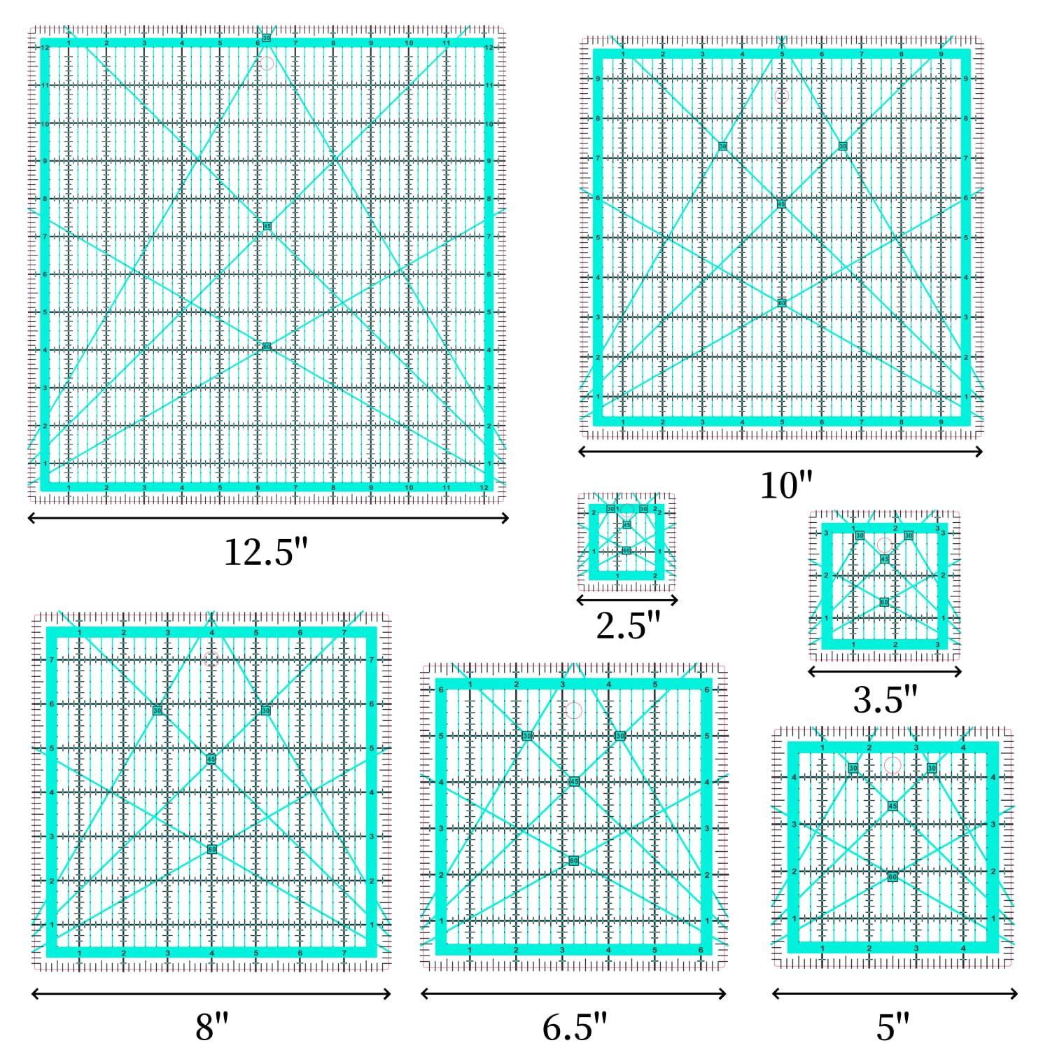 - Quilting Cutting Squares Set:Our quilting rulers includes 7 quilting square rulers (2.5'',3.5",5",6.5'',8",10",12.5")to meet all your patchwork needs.The non-slip rings keep the quilting templates in place to ensure cutting accuracy