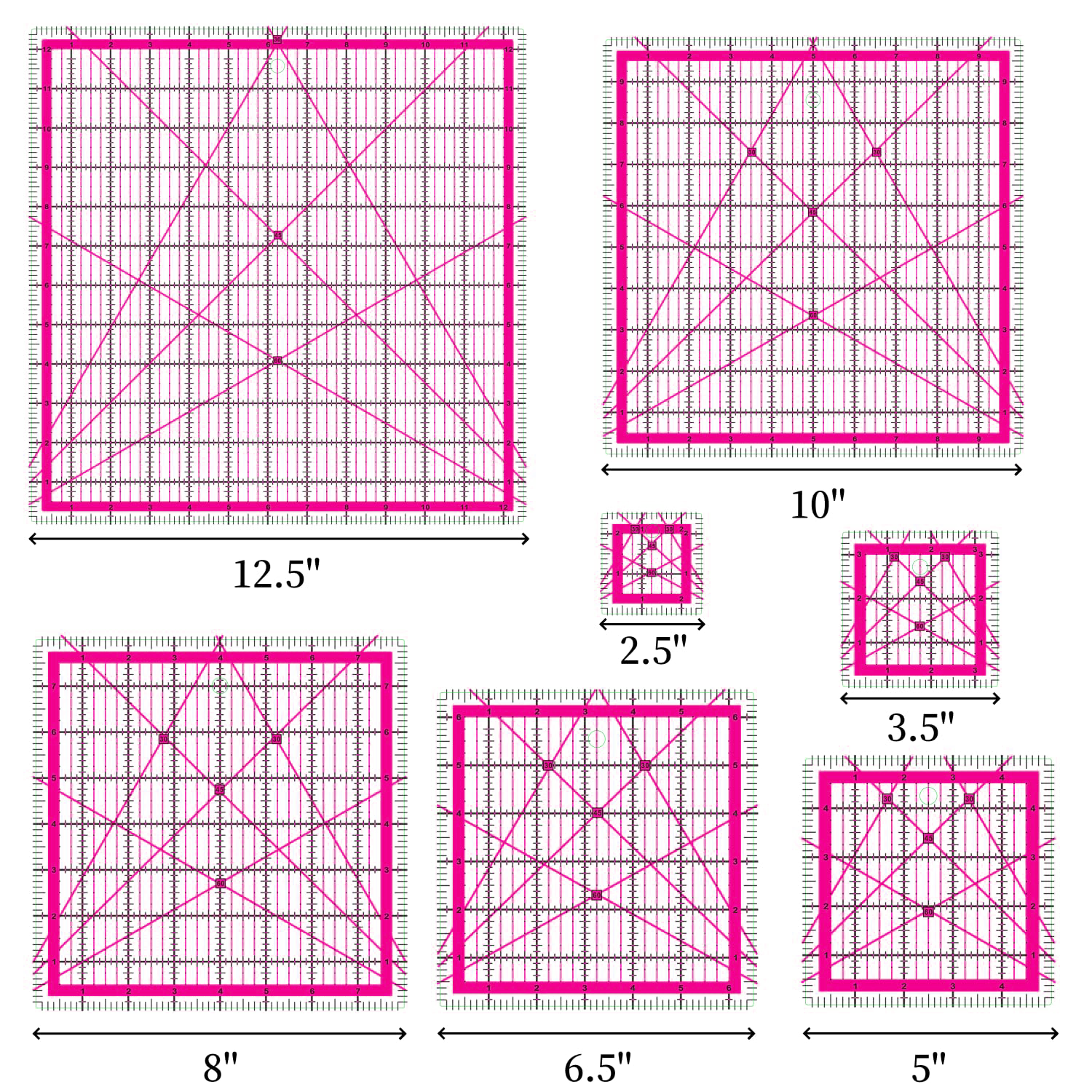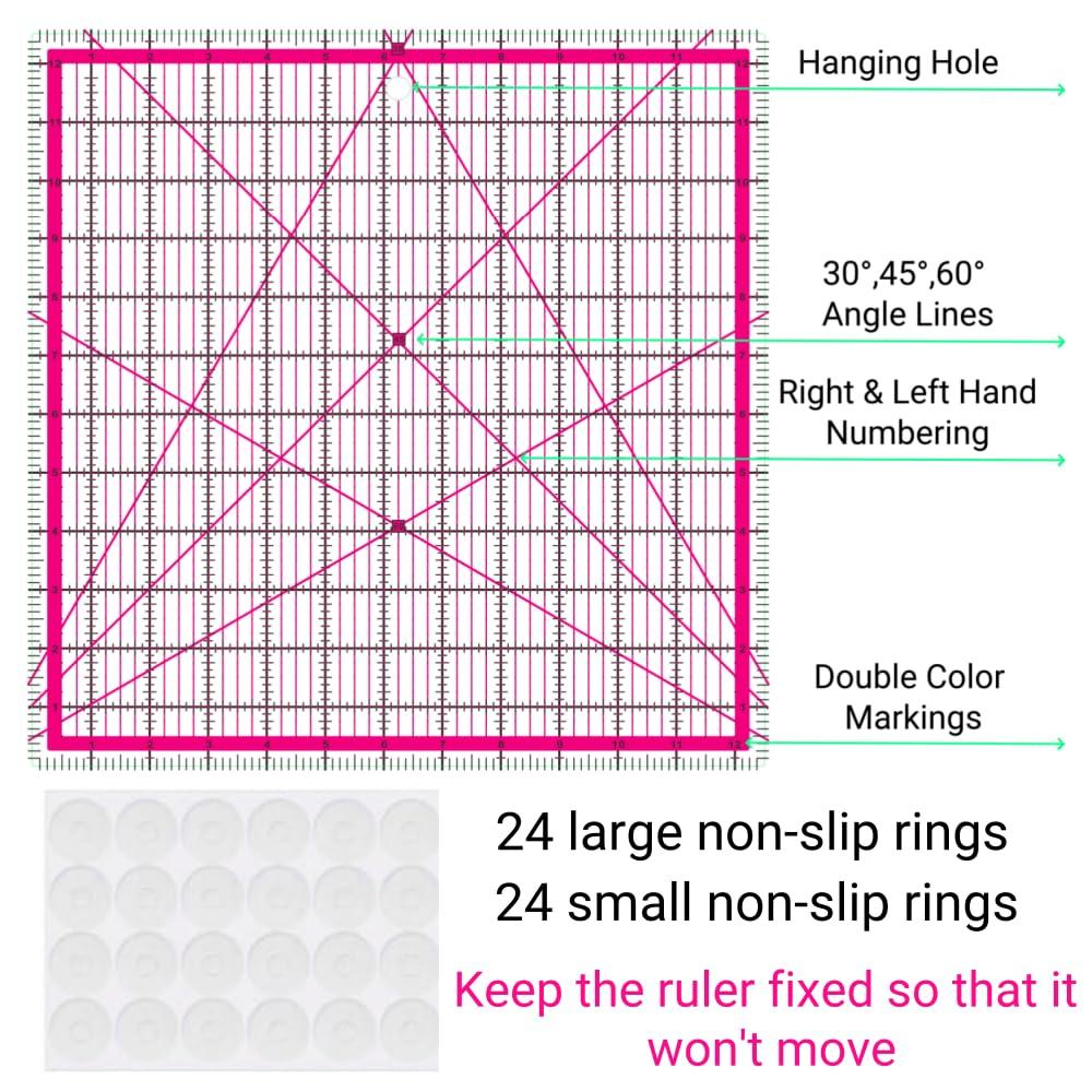- Quilting Square:Our quilting rulers includes 7 quilting square rulers (2.5",3.5",5",6.5",8",10",12.5") to meet all your patchwork needs.The non-slip rings keep the quilting templates in place to ensure cutting accuracy