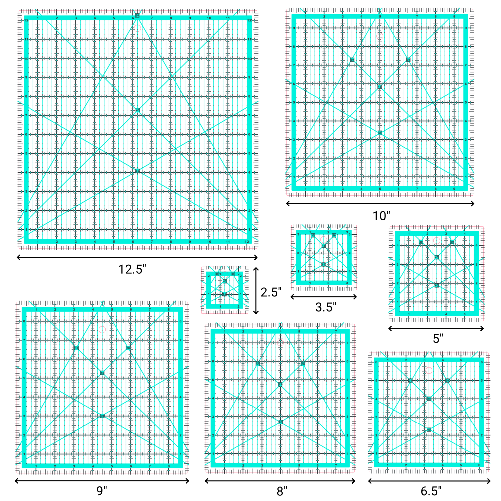 - Quilting Square Rulers:Our quilting rulers includes 8 quilting square rulers (2.5",3.5",5",6.5", 8",9",10",12.5")to meet all your patchwork needs.The non-slip rings keep the square quilting ruler in place to ensure cutting accuracy