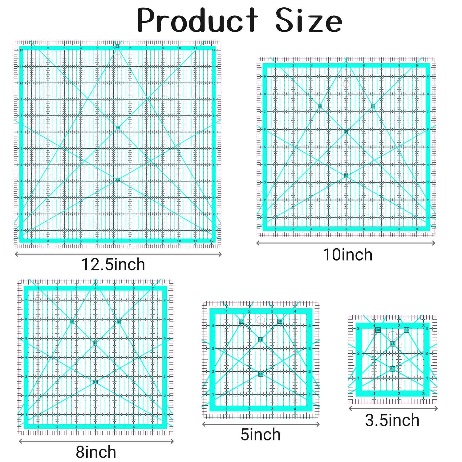 - Quilting Cutting Squares Set:Our quilting rulers includes 5 quilting square rulers (3.5",5",8",10",12.5")to meet all your patchwork needs.The non-slip rings keep the quilting templates in place to ensure cutting accuracy
