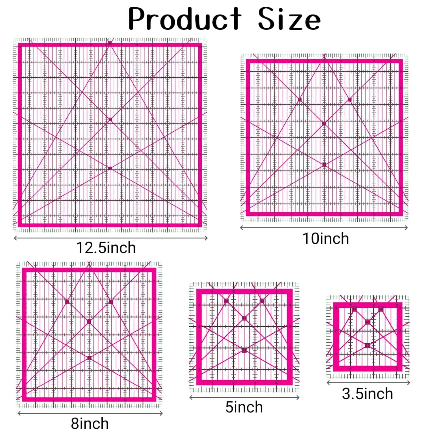 - Quilting Square Rulers:Our quilting rulers includes 5 quilting square rulers (3.5",5",8",10",12.5")to meet all your patchwork needs.The non-slip rings keep the square quilting ruler in place to ensure cutting accuracy