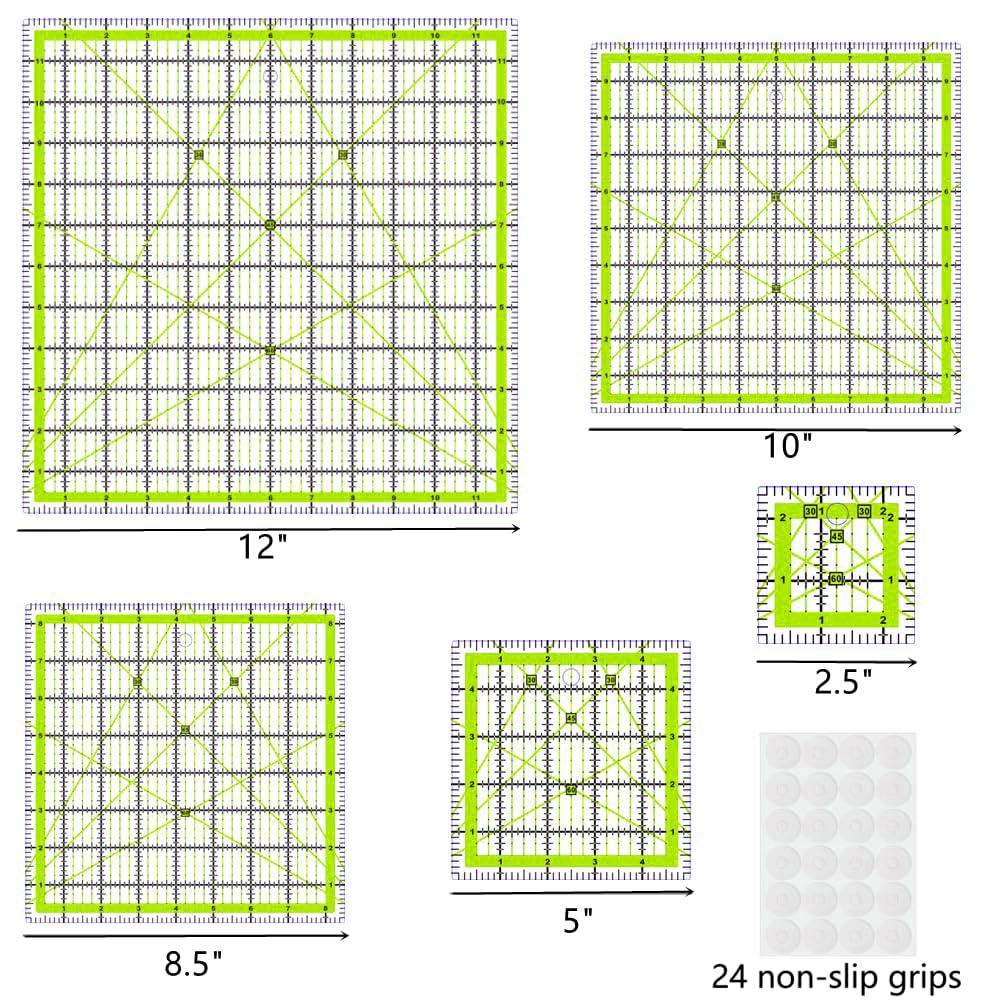 - Good Value:Quilting rulers includes 5 quilting square rulers (2-1/2",5",8-1/2",10",12")to meet your different needs.The non-slip rings keep the quilting templates in place to ensure cutting accuracy