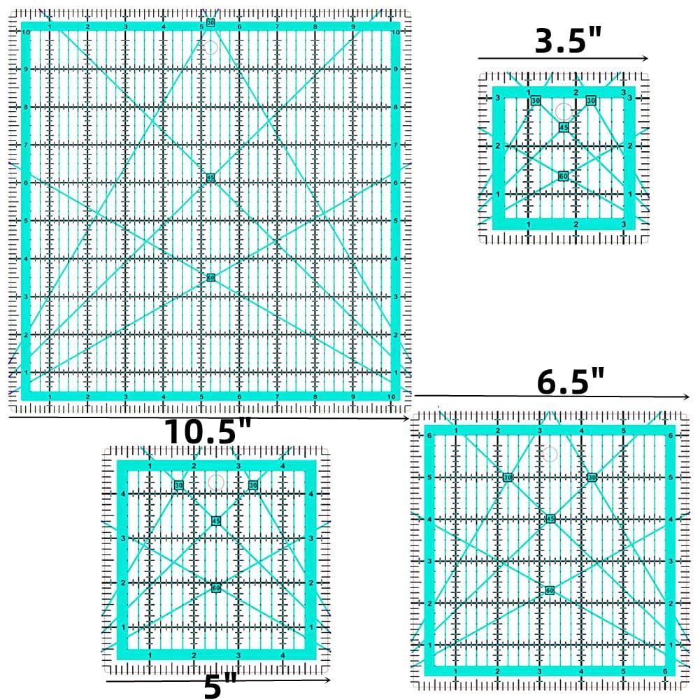 - Good Value:Quilting rulers includes 4 quilting square rulers (3-1/2",5",6-1/2",10-1/2")to meet your different needs.The non-slip rings keep the quilting templates in place to ensure cutting accuracy