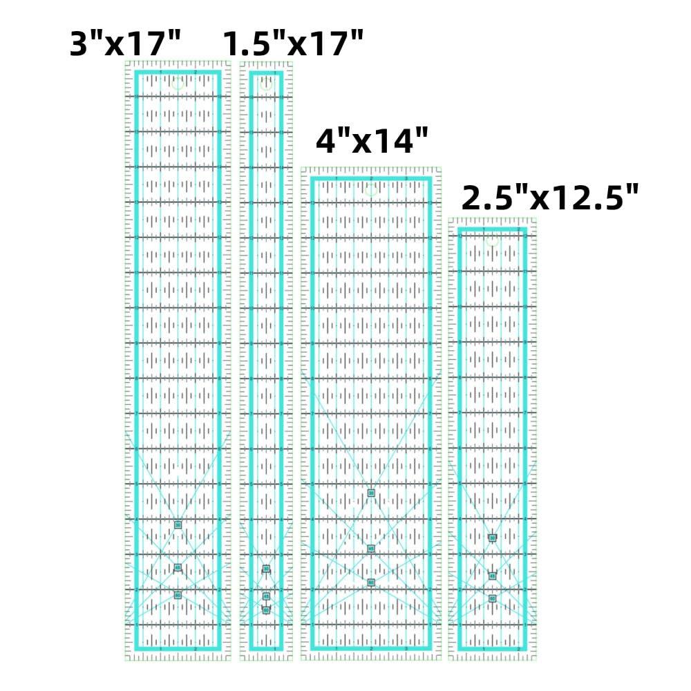- Good Value:Quilting rulers includes quilting rulers and templates(3"x17",1.5"x17", 4"x14",2.5"x12.5",6"x12",1.5"x10",3"x6",1"x6")to meet your different needs.The non-slip rings keep the quilting templates in place to ensure cutting accuracy